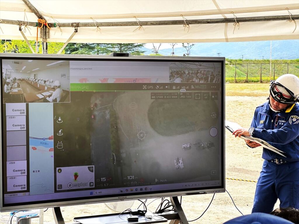 訓練では、参加した職員・隊員のボディカメラやスマートグラスに加え、宮城県警本部のヘリコプター、仙台市消防局のドローンからの空撮映像を受信し、災害対策本部内のディスプレイに配信などがされた。