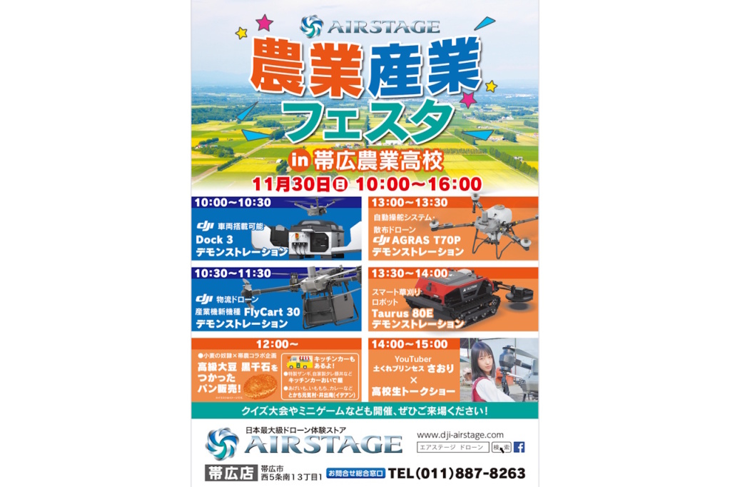 株式会社AIRSTAGE(本社:北海道弟子屈町、代表取締役:久保直人)(以下、AIRSTAGE社)は、2025年11月30日に北海道帯広農業高等学校にて、最先端の農業DX技術を体験できるイベント『AIRSTAGE農業産業フェスタ in 帯広農業高校2025』を開催する。